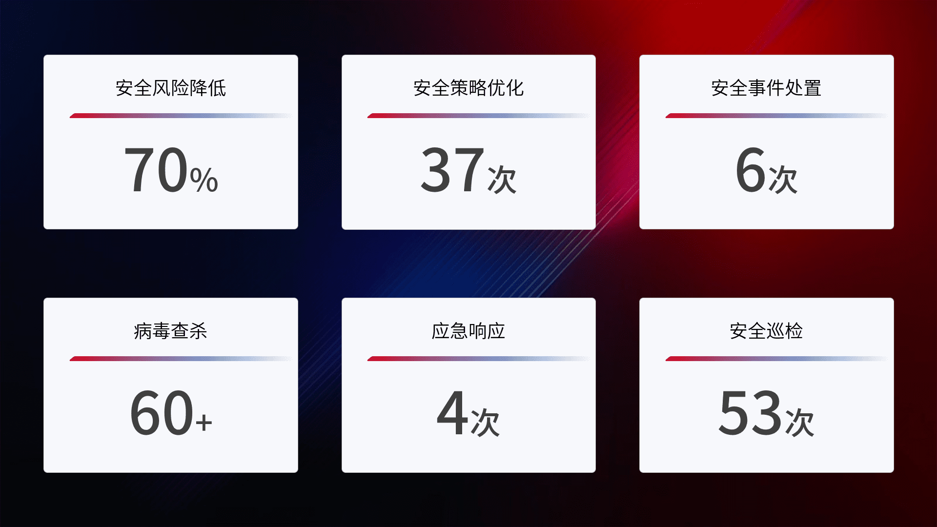 提供全面的安全事件报告体系,,包括处置报告、、周报、、、季度和年度总结,,,结合持续监控,,帮助客户深入了解网络安全状况。。。。
