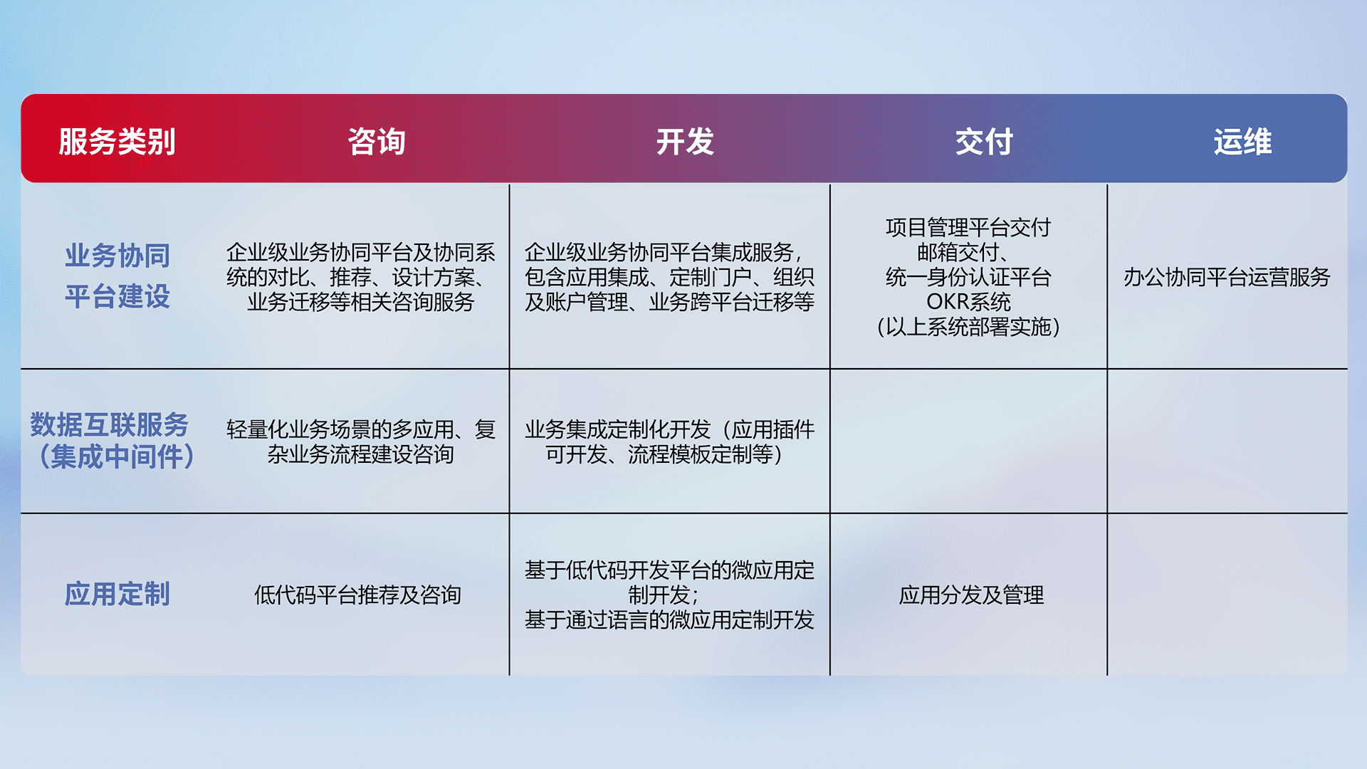 针对钉钉、、企微、、IDaas等平台级产品提供产品的规划、、、方案、、、交付、、、定制化开发等服务,,,,实现如统一协同办公、、智能客户服务、、混合会议管理、、智能数据查询、、、等业务场景,,,实现数字化转型。。。