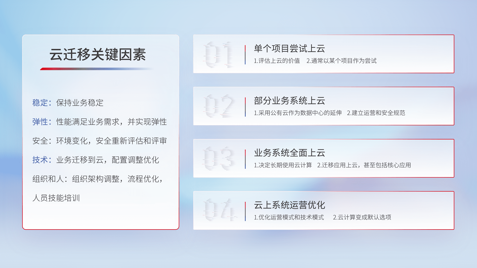 结合实际业务,,从规划设计、、、云平台选型、、云原生改造、、数据迁移、、集成交付,,,迁移全过程为客户识别最佳上云路径,,,,做好风险识别管理,,,设计网络架构、、身份权限、、、、安全审计合规、、、、操作审计、、、、日志审计、、、、监控告警策略、、、、多站点容灾设计等,,,对云上基础设施进行整体规划,,,,提升IT治理水平,,,,以满足弹性、、、高可用、、、、高性能的需求。。。
